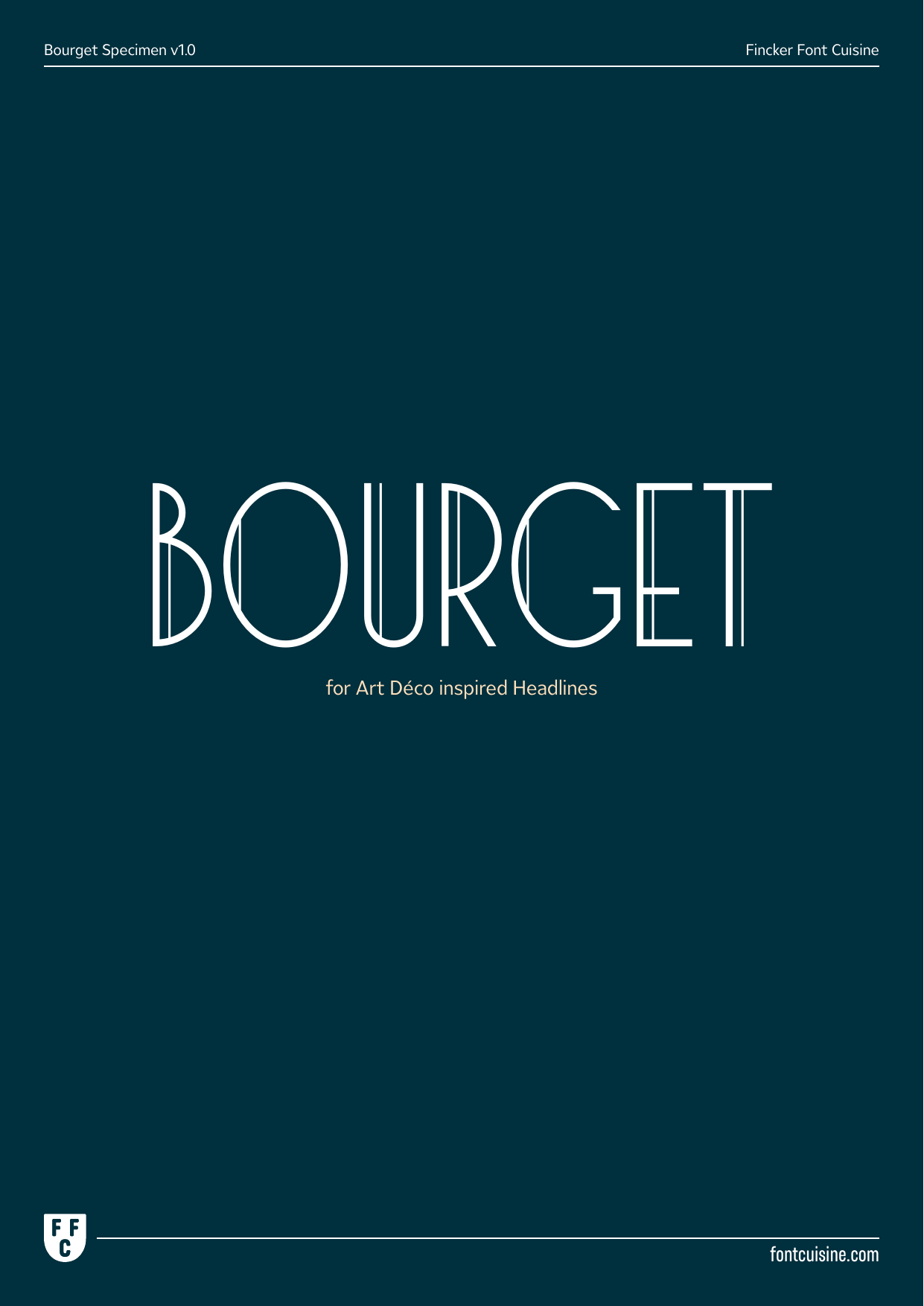 Bourget is a Display-Sans, which is inspired by the Art Déco Typography of the 1920’s, 1930’s years. It has a very characteristic and unique style by its thin line through every letter.